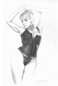 2015Half uitgewerkte tekening van Danni Ashe, met de focus op de leren laarzen.