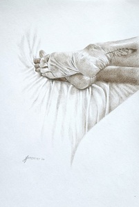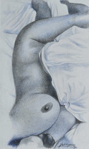 2014Het lijnenspel van de strepen over de mooie rondingen van dit model was een mooie uitdaging. De pose deed me denken aan de David van Michelangelo... vandaar de titel Davida. Achtergrond met paletmes, het model met penselen.